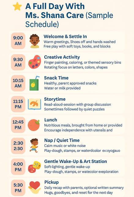 To evolve Ms. Shana Care & Services into a licensed, Black-woman-owned childcare business that offers:A dedicated care space for the youth, with special programmingCertified early childhood education curriculumFamily workshops, outings, and eventsExpanded care options for low-income and single-parent householdsWith your support, I aim to scale and solidify this community-rooted service now, until the goal is met for a physical location.